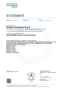 Entaksi Solutions SpA – Irish Branch è inoltre un Qualified Trust Service Provider (QTSP) specializzato nell’erogazione di Servizi Fiduciari di rilascio di certificati qualificati per firme elettroniche e sigilli, creazione di marche temporali elettroniche e conservazione a lungo termine di firme elettroniche e sigilli.