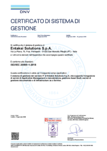 Le certificazioni sono state emesse da DNV, uno dei principali enti di certificazione a livello mondiale. Entaksi ha voluto conseguire queste certificazioni per rendere evidenti e oggettivi l’attenzione e la cura rivolta alla soddisfazione del cliente, l’impegno con cui l’azienda propone e fornisce soluzioni e servizi di eccellenza, e lo sforzo teso al continuo miglioramento degli stessi.