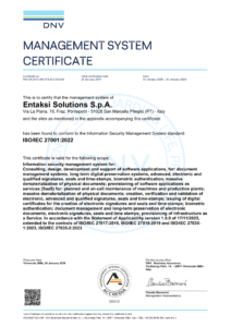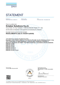 Entaksi Solutions SpA – Irish Branch is also a Qualified Trust Service Provider (QTSP), specialized in delivering Trust Services such as issuing qualified certificates for electronic signatures and seals, creating electronic timestamps, and long-term preservation of electronic signatures and seals.